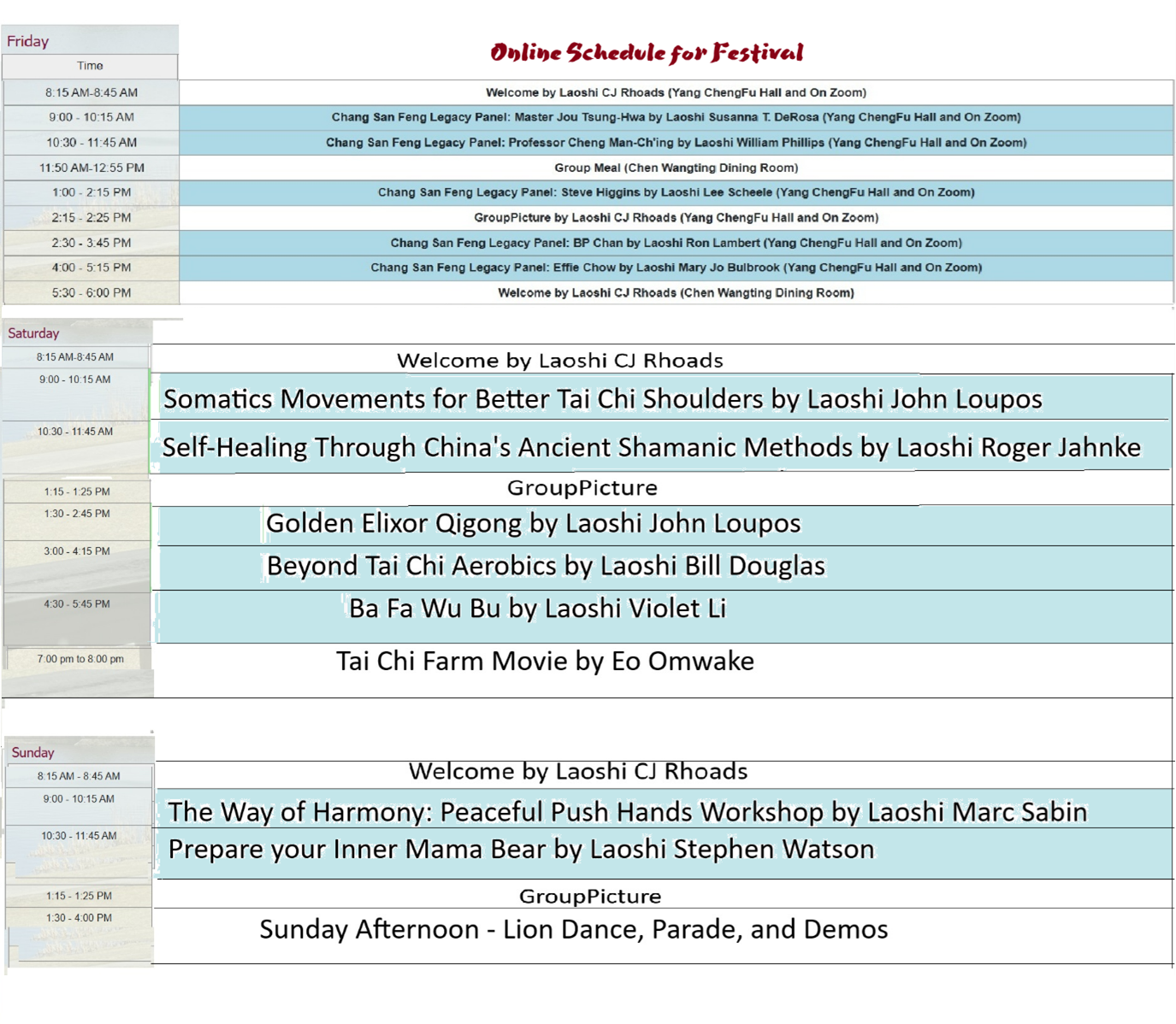 | 4:30 - 5:45 PM | Ba Fa Wu Bu by Laoshi Violet Li | T’ai chi Cheng Man Ching Short Yang Form – Releasing into the Ground and Allowing the Energy to Fill your Body by Laoshi Jano Cohen | Taoist Temple Bone Breathing Qigong by Laoshi Ramsey Yunan | |||